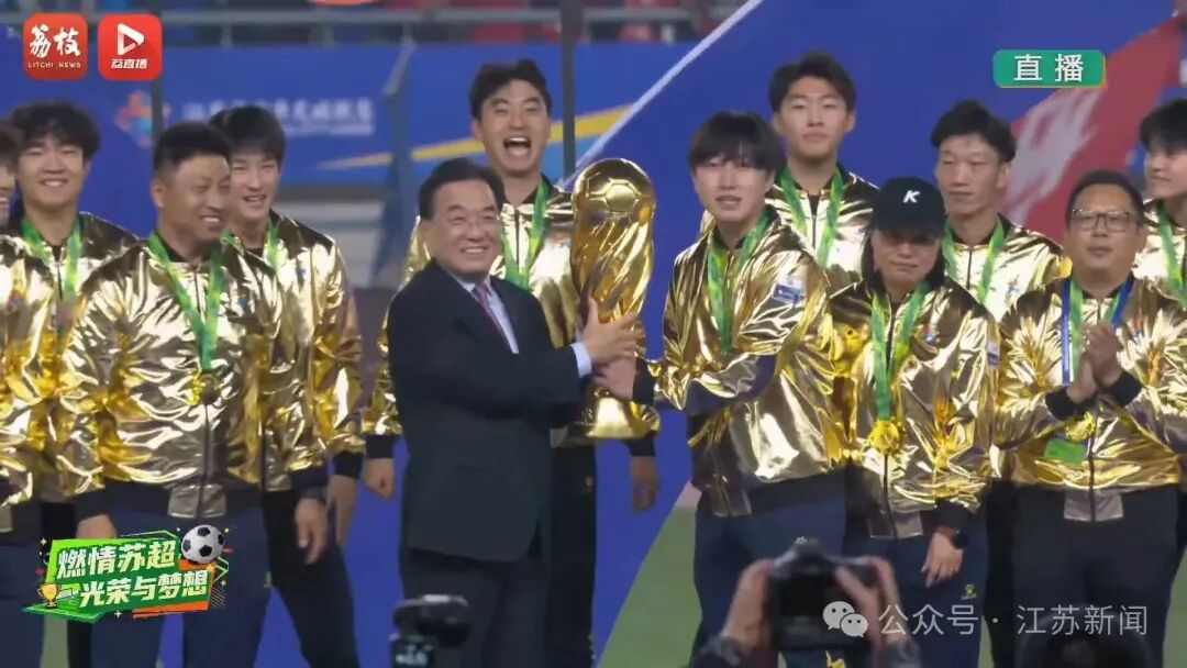 11月1日晚,2025江苏省城市足球联赛决赛落幕。本场比赛由国缘V3特约转播。90分钟常规时间泰州队和南通队0比0战平。“苏超”决赛上演点球大战。最终,泰州队点球4比3战胜南通队,获得“苏超”冠军。江苏省委书记信长星亲自为冠军队颁奖。