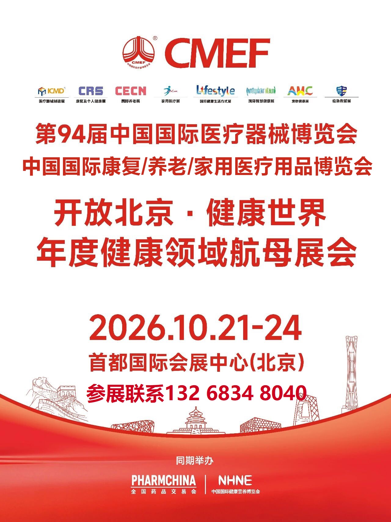 2026年10月21-24日,CRS、CECN、LifeCare&第94届CMEF,将登陆北京·首都国际会展中心。主办方国药励展将携手全球医疗健康及康复养老行业同仁,共同探索新时代行业高质量发展的全新机遇。看图选位,联系我,许经理13268348040